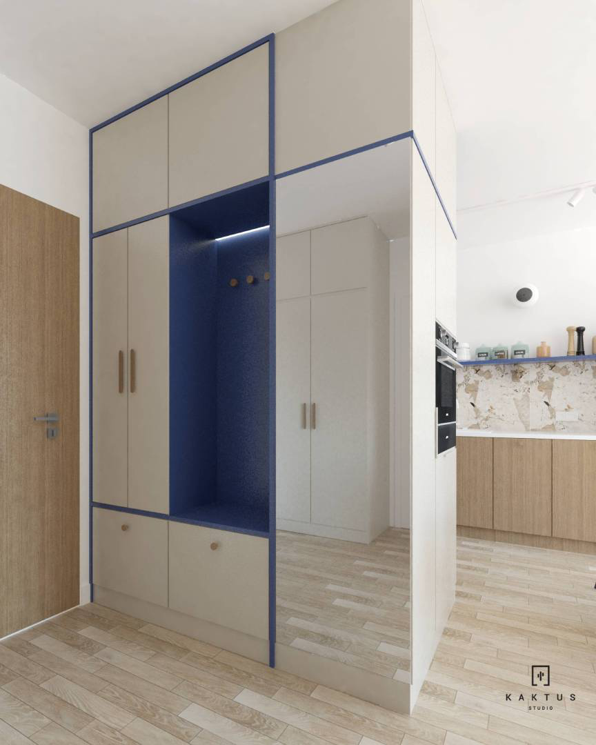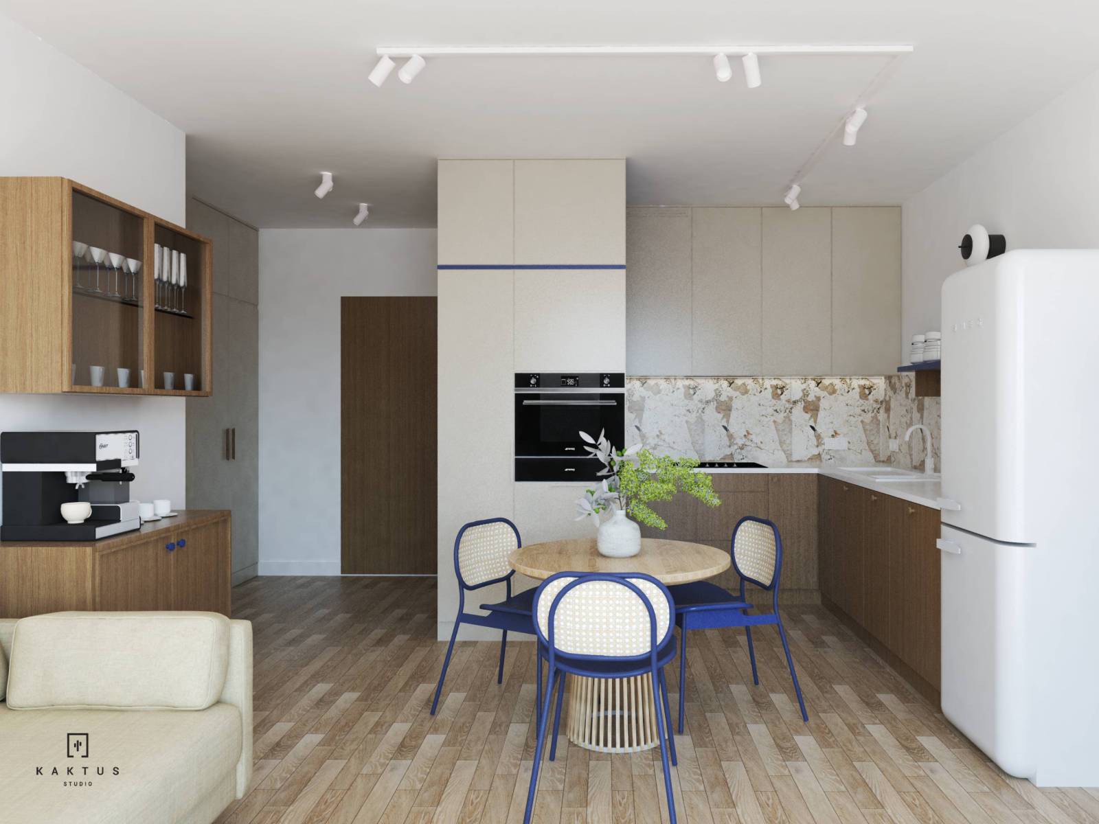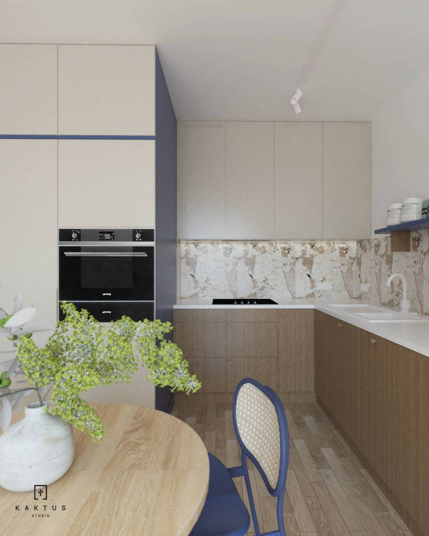 Szczególną uwagę poświęcono niewielkiemu aneksowi kuchennemu, który dzięki sprytnym rozwiązaniom zyskał lekkość i przyjemny klimat. Ukryte schowki, przemyślana zabudowa oraz zabiegi optycznie powiększające przestrzeń sprawiają, że kuchnia jest nie tylko funkcjonalna, ale również atrakcyjna wizualnie.
