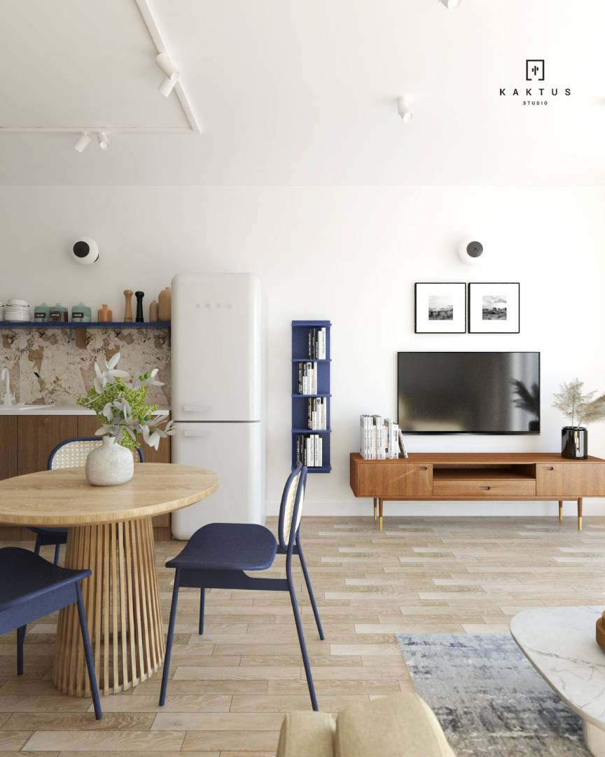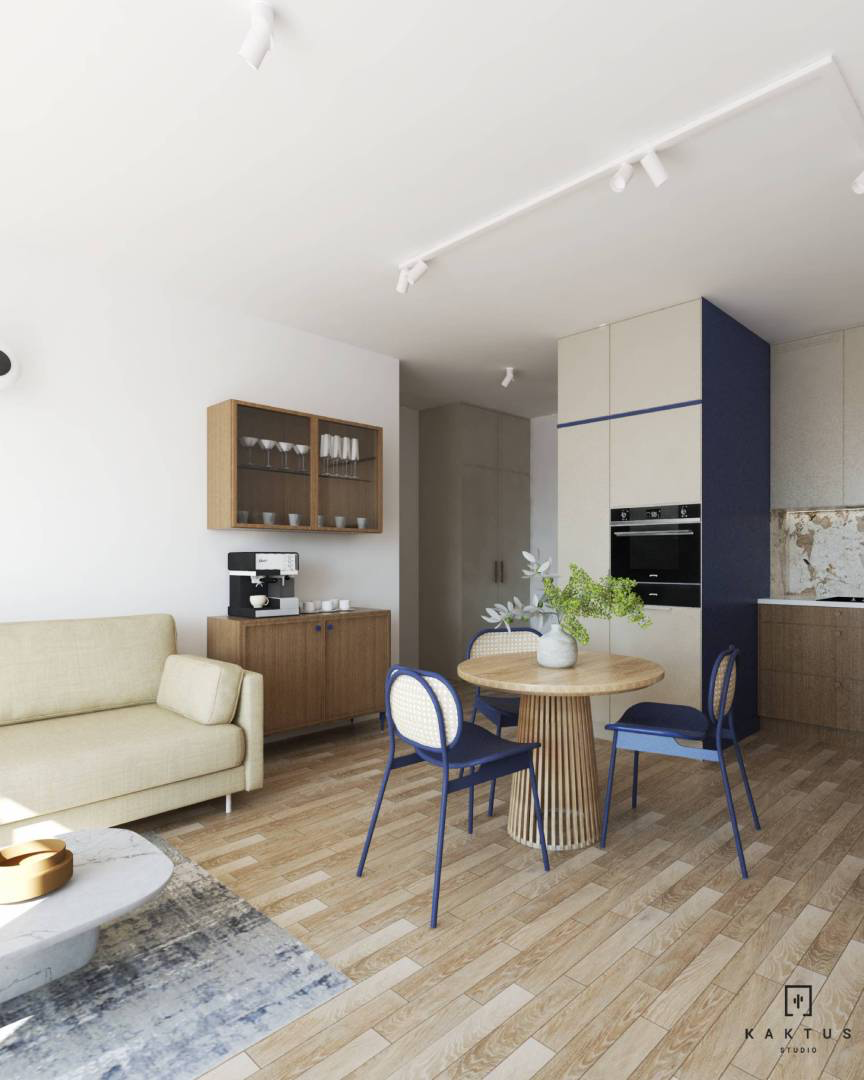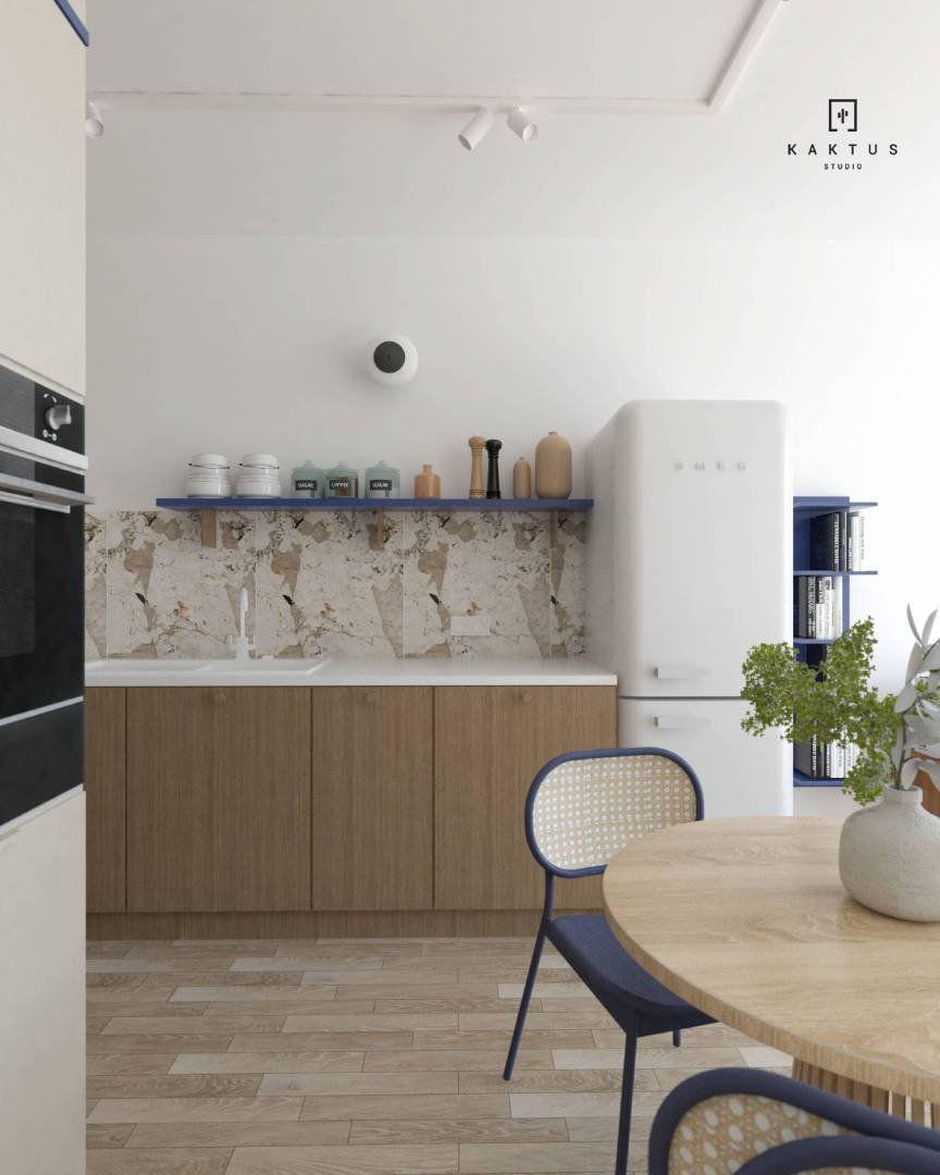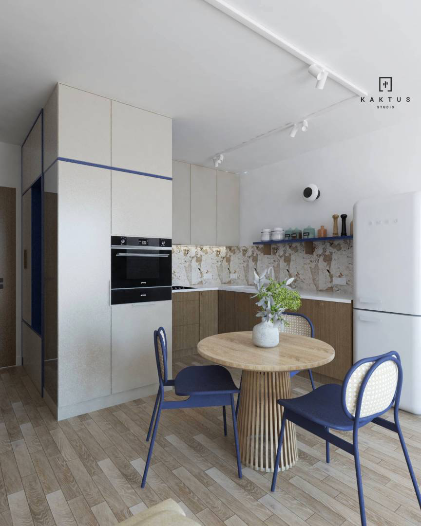 Szczególną uwagę poświęcono niewielkiemu aneksowi kuchennemu, który dzięki sprytnym rozwiązaniom zyskał lekkość i przyjemny klimat. Ukryte schowki, przemyślana zabudowa oraz zabiegi optycznie powiększające przestrzeń sprawiają, że kuchnia jest nie tylko funkcjonalna, ale również atrakcyjna wizualnie.