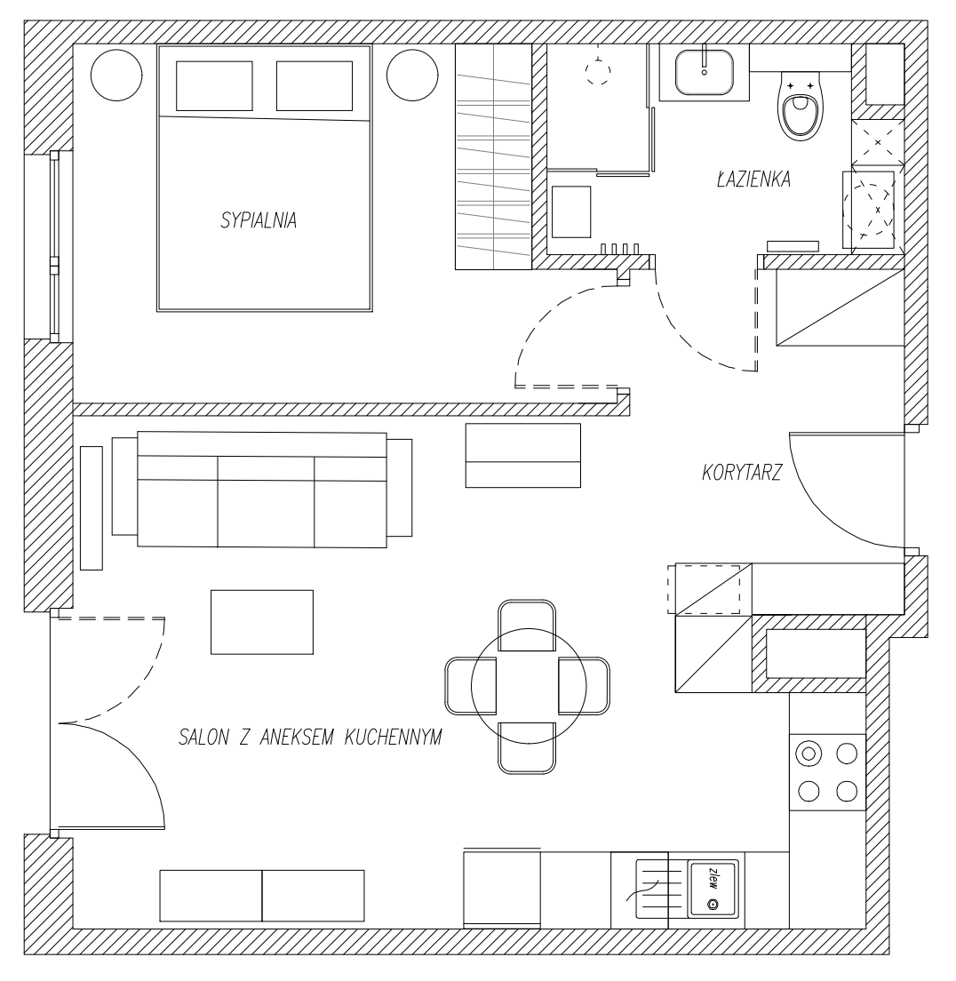 Układ funkcjonalny został zoptymalizowany tak, aby maksymalnie wykorzystać dostępny metraż, bez poczucia przeładowania przestrzeni. Każda strefa ma swoje jasno określone zadanie, co bezpośrednio przekłada się na komfort codziennego użytkowania.