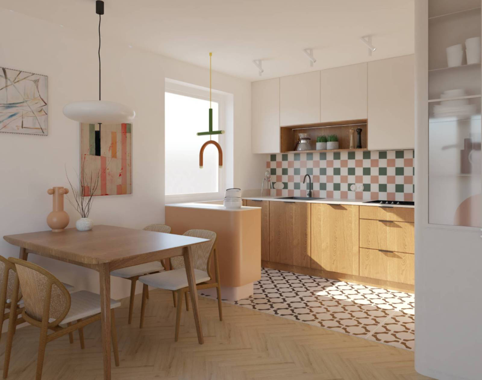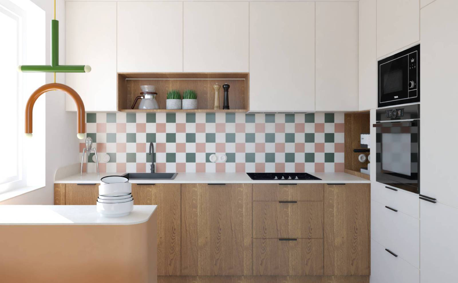 Centralnym punktem wnętrza jest salon z kuchnią i charakterystyczną wyspą o zaoblonej formie, która nadaje przestrzeni indywidualny rytm. Odważne zestawienia kolorów i materiałów podkreślają charakter mieszkańców, tworząc spójną, pełną energii przestrzeń.
