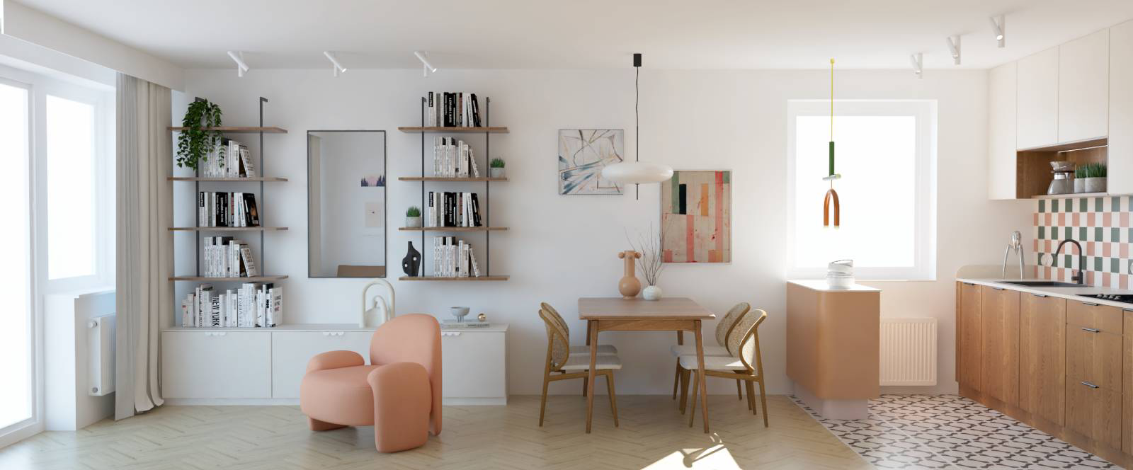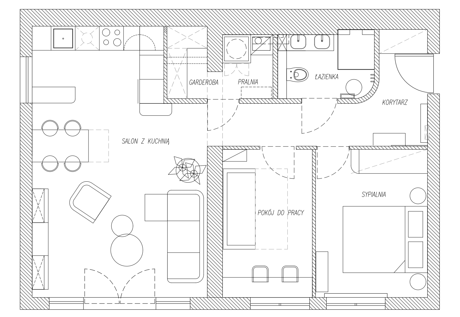 Ten projekt mieszkania w Krakowie powstał jako odpowiedź na potrzebę stworzenia przestrzeni, która łączy wyrazisty charakter z codziennym komfortem, o jakim marzyli moi klienci Jarek i Kasia. Kluczowe było wyraźne oddzielenie strefy dziennej od prywatnej oraz zaprojektowanie dodatkowego pokoju do pracy i dla gości.